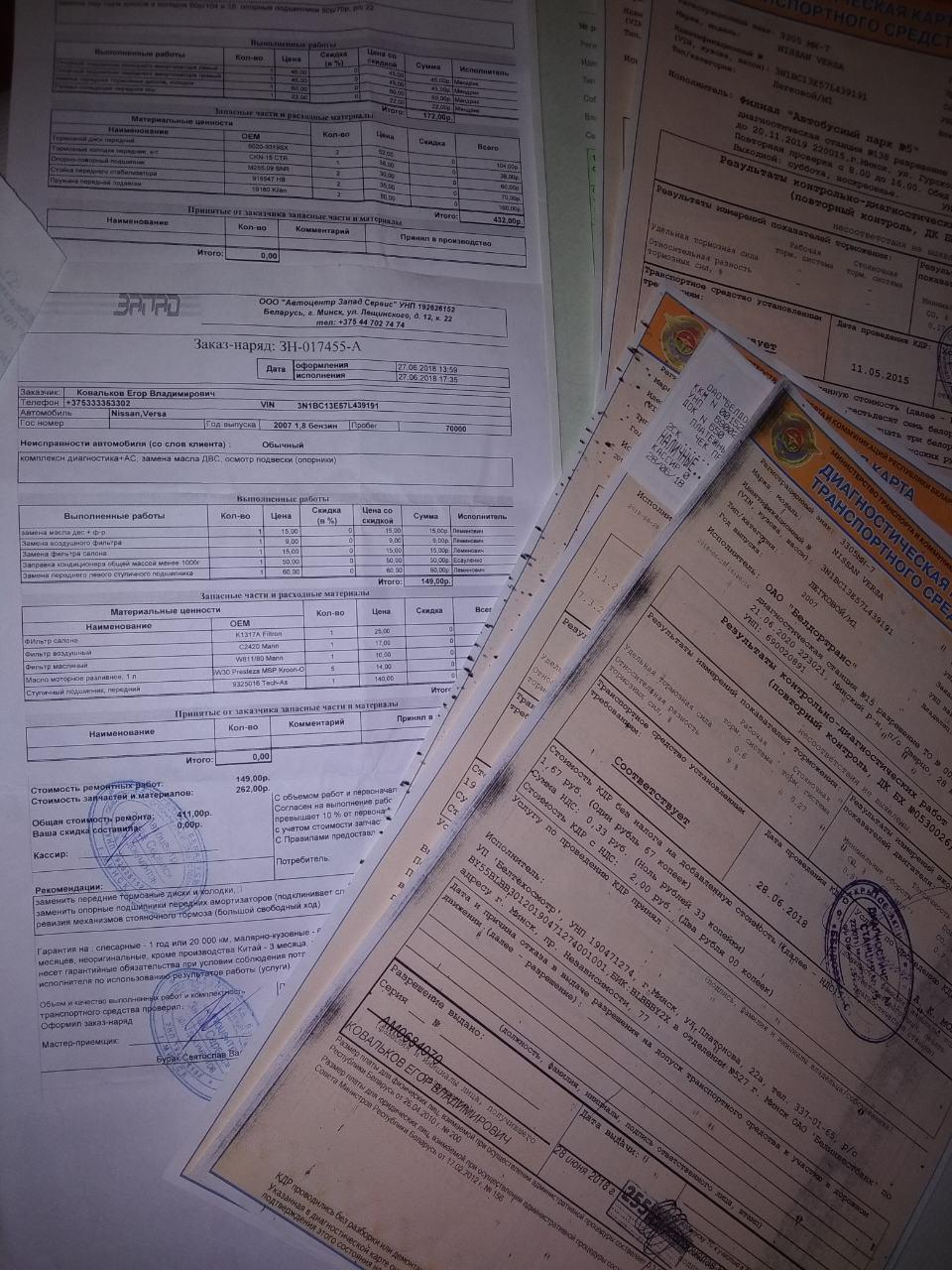 4. Подвеска перебрана полностью летом 2018 года на СТО (перед поездкой из Минска в Питер на всякий случай менялось по максимум, машина надёжно себя проявила, без сюрпризов). Т.е. состояние не требует доп. затрат на это дело – (даже фильтры салона). Полный список в бумаге из СТО прилагаю.
